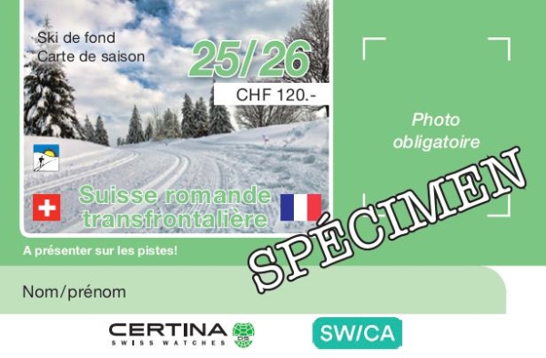Vendue au prix de CHF 160.-, cette carte permet l’accès à toutes les pistes de ski de fond de Suisse. Elle permet aussi l’accès aux pistes de ski de fond des Massifs du Jura français (Ain, Jura, Doubs) et donne droit à une réduction de 50% sur les cartes journalières de Haute-Savoie.